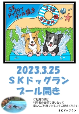 2023年03月21日 SKドッグランプール開き(2023.3.25) SKドッグランのプールが3月25日~ご利用できます。 たくさんのワンちゃんたちが遊べるよう、ご利用者の皆様で譲り合ってご利用ください。