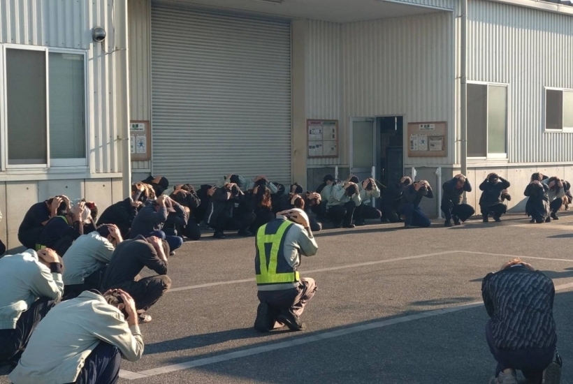 2023年11月01日 シェイクアウト訓練実施 2023年11月1日 全体朝礼後にシェイクアウト訓練を実施しました。 「シェイクアウト訓練」は、2008年にアメリカで始まった地震に備える防災訓練で、低い姿勢で、頭を守り、揺れが収まるまで動かないという3つの行動で身を守ります。 いざという時に身を守る行動をとるには訓練が欠かせません。榊原工業は今後も定期的に訓練を続けます。