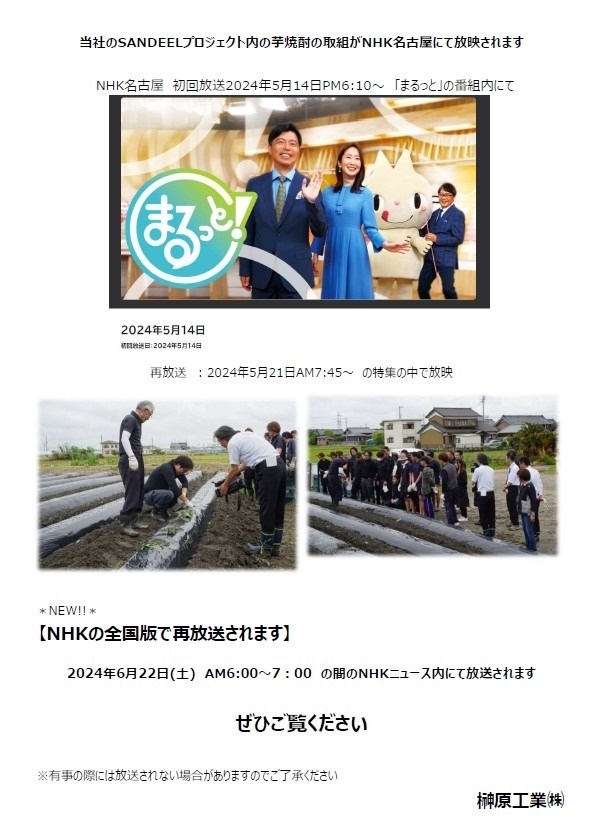 2024年06月20日 SANDEELプロジェクト NHKにて放送されます 当社のSANDEELプロジェクトの一環でつくった芋焼酎「SANDEEL」がNHKにて放送されます。 2024年6月22日6時~7時の間のニュースのどこかで5分程度流れます。 ぜひご覧ください!